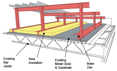 The Post and Purlin system adds a continuous base zee, which enables it to be installed over steel bar joists that are spanning perpendicular to the new roof slope. |