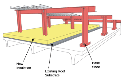 For structural concrete roofs on existing buildings, the Post and Purlin system uses base shoes and posts that are installed centered over the existing concrete beams. When the beams span perpendicular to the new roof slope, a base shoe is still used, dependent on the spacing of the beams in relation to the retrofit purlin’s span capacity. Otherwise, a continuous base zee would be included in the system. |