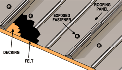 These panels are installed over decking and felt paper for new construction or over framing strips when applied over existing roofing materials. Fasteners are then driven through both panel surface and panel laps to secure them to the decking or framing strips. |
