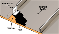 Medallion-Lok panels are joined together by an integral locking seam and are held in place with concealed metal clips. The clips are simply attached to the roofing substrate with fasteners. |