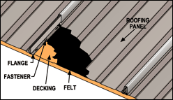 Meridian panels are also joined together by an integral locking seam. However, with Meridian, special clips are not required because the panels are equipped with a slotted flange leg. Pancake head fasteners are placed in the slots to hold panels in place. |